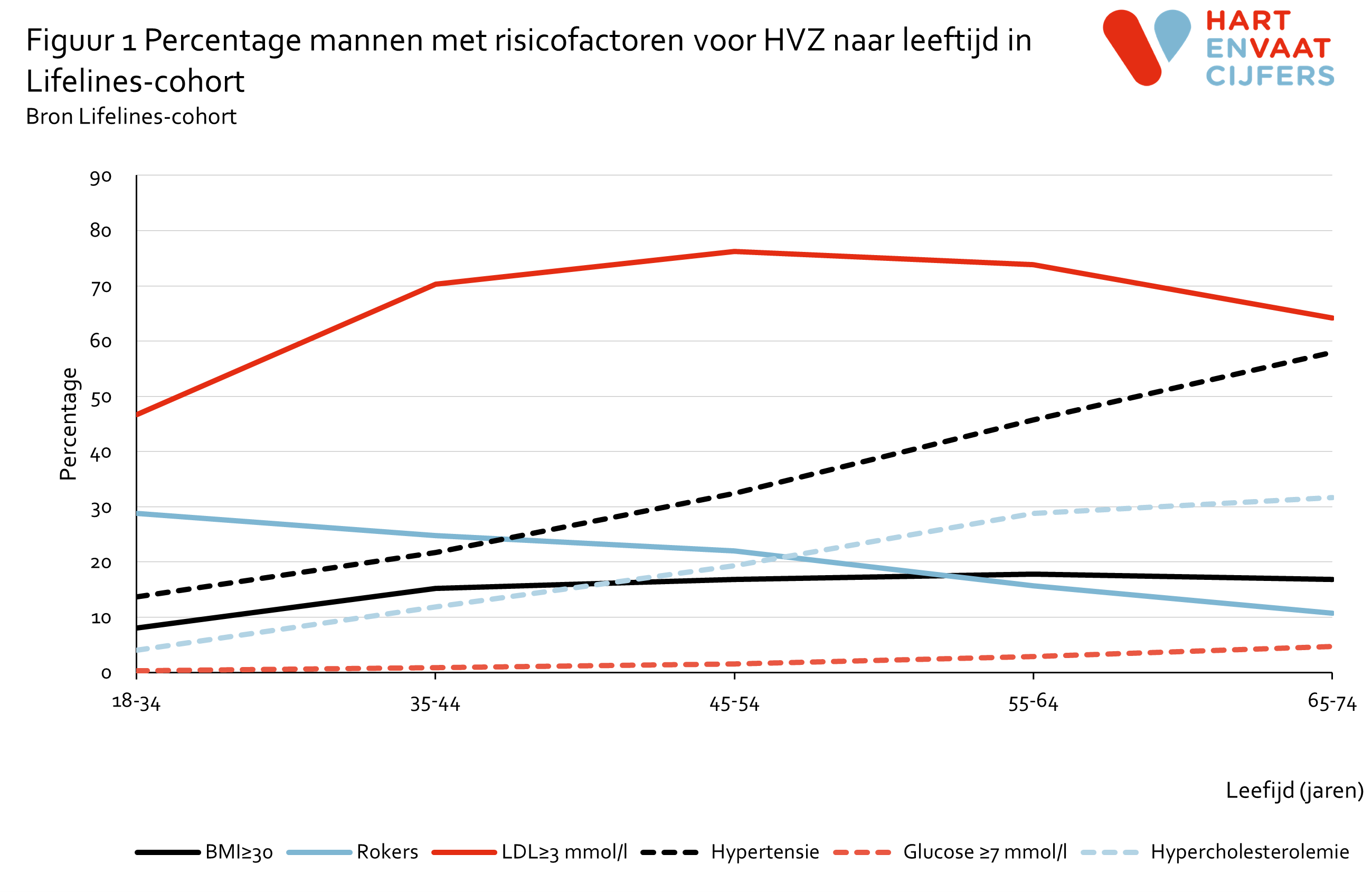 5 leeftijdsklassen en geslacht betreffen een detaillering van de cijfers die al eerder gepresenteerd zijn van Lifelines waarbij ten aanzien van de risicofactoren voor hart- en vaatziekten alleen cijfers van onder en boven de 65