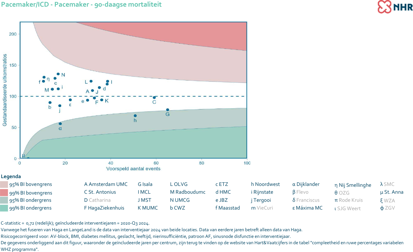 Meer informatie t.a.v. de gehanteerde statistische methode onderliggend aan de gepresenteerde cijfers en figuren, en de interpretatie hiervan staat beschreven in de analysemethodiek van de NHR.